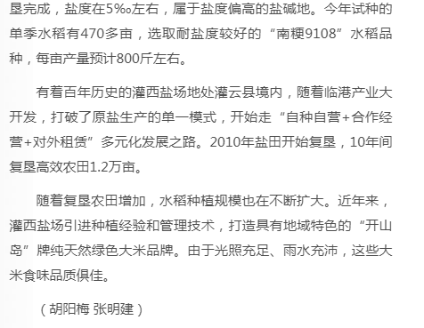 有著百年歷史的灌西鹽場(chǎng)地處灌云縣境內(nèi),隨著臨港產(chǎn)業(yè)大開(kāi)發(fā),打破了原鹽生產(chǎn)的單一模式,開(kāi)始走“自種自營(yíng)+合作經(jīng)營(yíng)+對(duì)外租賃”多元化發(fā)展之路。2010年鹽田開(kāi)始復(fù)墾,10年間復(fù)墾高效農(nóng)田1.2萬(wàn)畝。