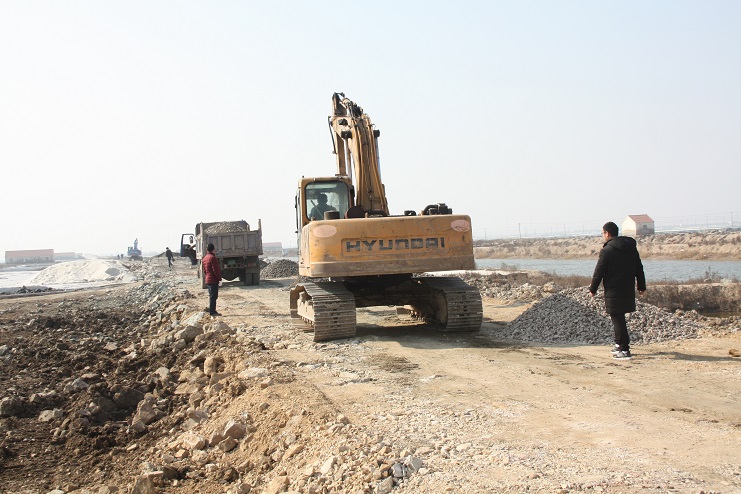 2月15日,在新河制鹽公司七至十班運(yùn)鹽路施工現(xiàn)場(chǎng),我們看到南翼公司項(xiàng)目工程分公司的員工正在指揮兩臺(tái)小型工程車將石子傾倒在路基上,兩臺(tái)挖掘機(jī)正忙于將運(yùn)送來的石子整平。運(yùn)鹽河對(duì)面,三輛滿載土夾石的大型工程車一字排開,正等待卸載。據(jù)了解,目前正在施工的是新河制鹽分公司二期運(yùn)鹽路維修改造工程,該工程改造路段全長(zhǎng)3300米,計(jì)劃總投資193萬元,其中路基鋪設(shè)部分由日曬制鹽公司出資45萬元,路面部分則由縣交通局承擔(dān),預(yù)計(jì)需要投入148萬元。該工程于去年底開始施工,預(yù)計(jì)三月中下旬全部鋪設(shè)完成。另外新河制鹽分公司一期一至十二班3300米運(yùn)鹽路改造工程計(jì)劃將于今年下半年實(shí)施。