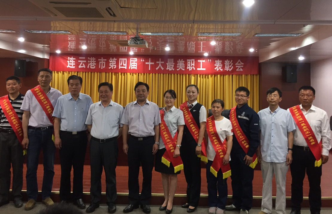 近日,在連云港市第四屆港城“十大最美職工”表彰會上,日曬制鹽新河分公司八班班長祝星星榮獲“十大最美職工”提名獎。在表彰會上,市總工會主席鄭平、丁維杰書記、宣傳部副部長李超領(lǐng)導與獲獎人員一起合影留念。