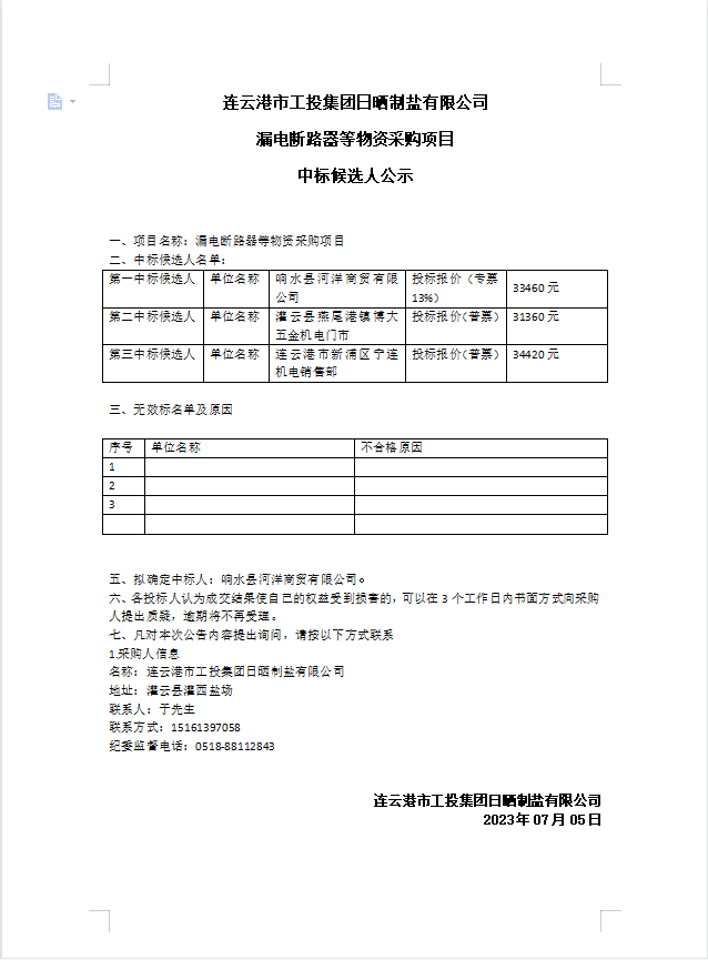 連云港市工投集團(tuán)日曬制鹽有限公司漏電斷路器等物資采購(gòu)項(xiàng)目中標(biāo)候選人公示