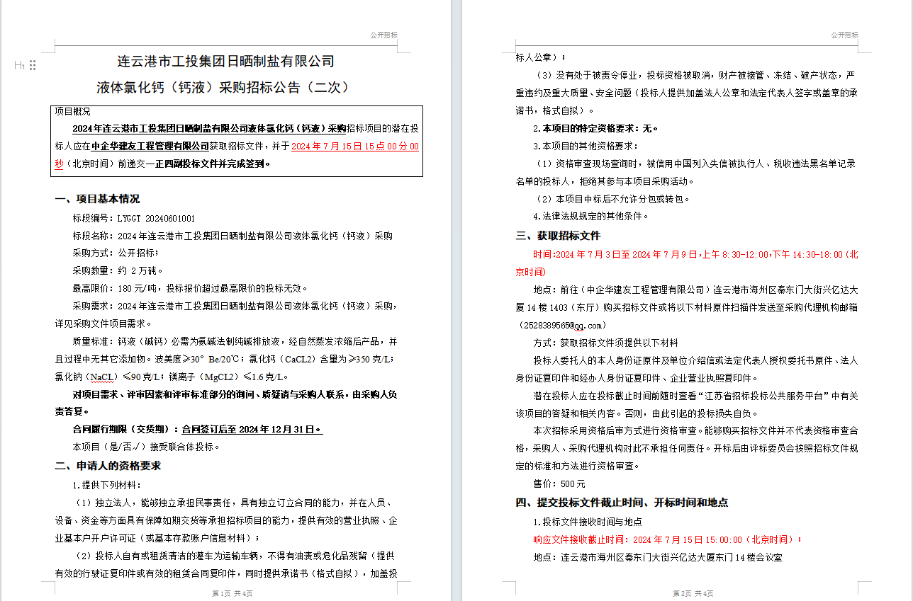 連云港市工投集團(tuán)日曬制鹽有限公司液體氯化鈣(鈣液)采購(gòu)招標(biāo)公告(二次)