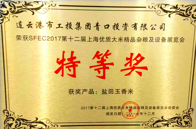 2017第十二屆上海優(yōu)質(zhì)大米及精品雜糧展覽會(huì),我公司“鹽田玉”大米榮獲特等獎(jiǎng),這是繼江蘇好大米稱(chēng)號(hào)之后的又一重大殊榮。