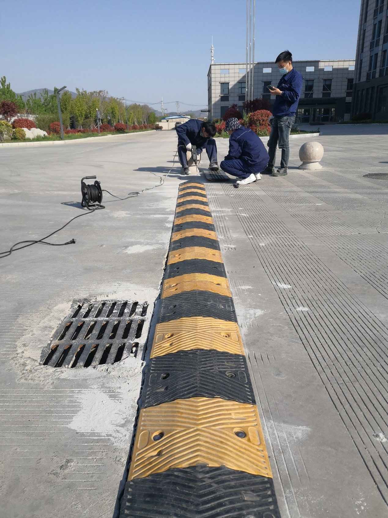 為了強化道路交通安全,公司在廠區(qū)主大門入口和停車場兩處加設減速帶。圖為安全管理部員工在現(xiàn)場施工。