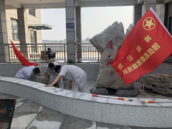 炎熱的天氣下,志愿者們不怕苦,不怕累,奮外賣力的清潔綜合辦公樓東側(cè)的廉政景觀池“清風(fēng)池”。大家齊心協(xié)力,不到一小時就把“清風(fēng)池”打掃得煥然一新。