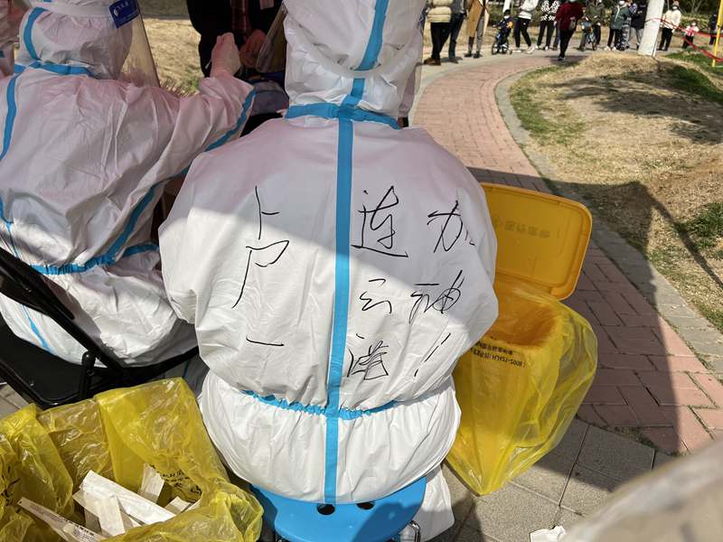3月12日?晴??8:00??簡(jiǎn)單的一碗泡面后,迅速到達(dá)社區(qū)核酸采樣點(diǎn),準(zhǔn)備上崗,社區(qū)負(fù)責(zé)人就“防護(hù)服穿脫”及防疫基本知識(shí)等注意事項(xiàng)給我們志愿者作簡(jiǎn)短的培訓(xùn),培訓(xùn)后,有點(diǎn)興奮的我穿好“大白服”,帶上手套、頭套和面罩,社區(qū)阿姨還幫我在衣服上畫上了可愛的涂鴉。