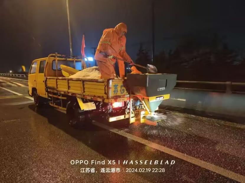 夜晚12點(diǎn),在佟圩路馬山立交,孫玉虎在工程車上一邊拋撒融雪劑一邊指揮:“融雪劑一定要撒布均勻,適當(dāng)擴(kuò)大距離,避免浪費(fèi)?!惫こ贪嘟鹑A、蘇志國(guó)、林軍、李林不停地在風(fēng)雪中揮舞著鐵锨,絲毫顧不上被風(fēng)雪擊打的面部疼痛。