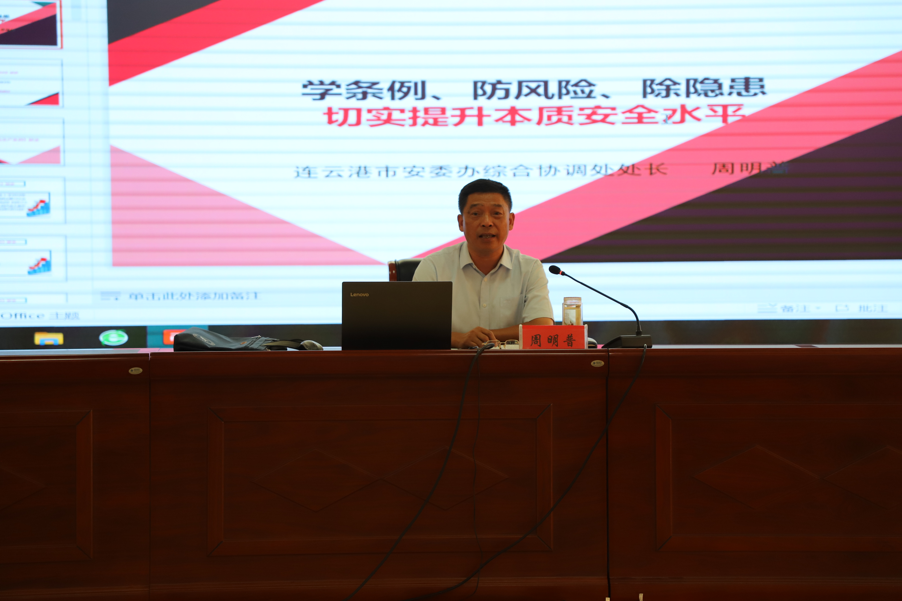 周處長對(duì)新《江蘇省安全生產(chǎn)條例》、安全生產(chǎn)重大事故隱患排查整治專項(xiàng)行動(dòng)、突出抓好當(dāng)前安全管理重點(diǎn)防范建議作了深入淺出的講解,同時(shí)結(jié)合我公司實(shí)際,提出很多建設(shè)性意見。